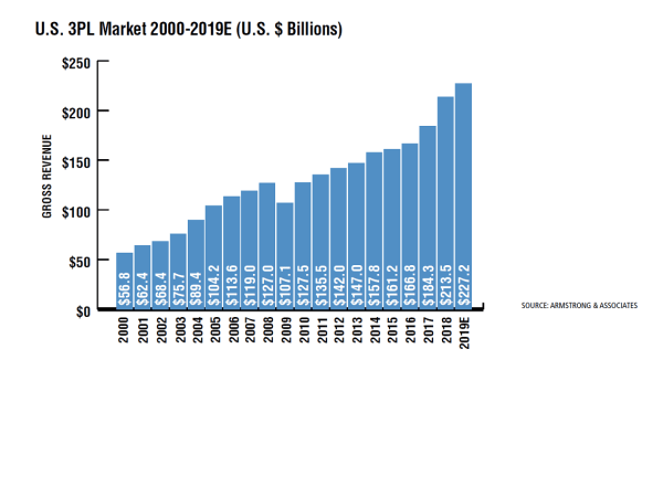 The U.S. 3PL market gross revenues increased 15.8%, bringing the total U.S. 3PL market to $213.5 billion in 2018. The last time the U.S. saw this level of 3PL gross revenue growth was in 2010 when the 3PL market bounced back 19% from its 16% decline in 2009 during the Great Recession.