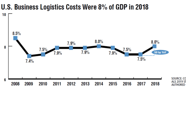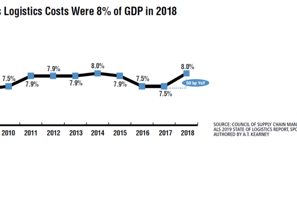 U.S. business logistics costs, as calculated in CSCMP’s 2019 State of Logistics Report, sponsored by Penske and authored by A.T. Kearney, rose 11.4% in 2018 to reach $1.64 trillion, or 8% of the $20.5 trillion GDP. All sub segments rose to their highest level since 2014, with private and dedicated fleets leading the way, up by 13%. Truckload was up 8.3%, LTL up 7.6%. Parcel was up over 7%, reflecting strong e-commerce growth and pricing power from providers. In addition, a buildup in inventory in the second half of the year drove inventory costs up 14.8%.