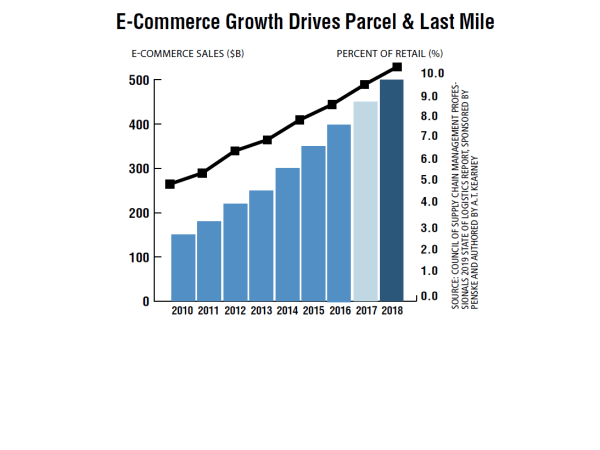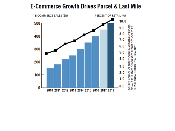 As e-commerce sales hit $513 billion, nearly 10% of total retail, in 2018, parcel expenditures rose 8.7% to $105 billion. Amazon is training customers to expect ever-faster deliveries, forcing competitors to chase those expectations, while at the same time growing its own transportation network and entering the third-party logistics business. This is sparking a furious pace of last-mile innovation, partnerships, and new technology.