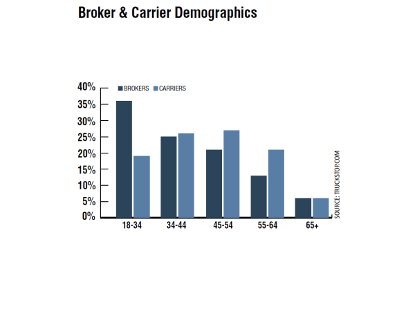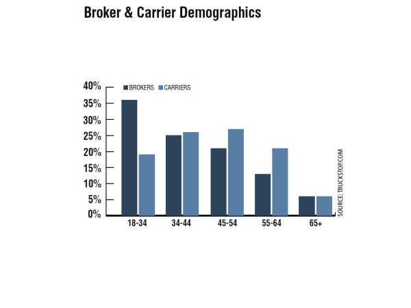 Brokers and carriers have similar age demographics in the 35-44 age bracket, but carriers have an older workforce from ages 45 to 64. Both brokers and carriers report that 12% are veterans. Of those, 13% are independent owner-operators with their own authority, and 23% own their truck and lease to a carrier.