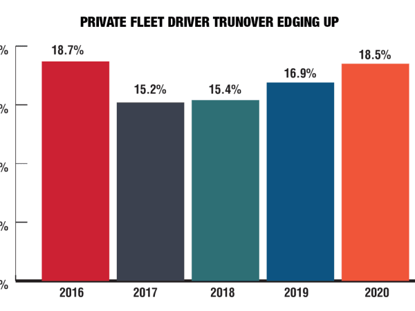 Although labor issues remain a significant challenge for respondents in the National Private Truck Council's annual survey, they continued to report retention and turnover performance far better than their for-hire colleagues. (The latest American Trucking Associations turnover figures released, from the third quarter of 2019, showed turnover at large truckload fleets at an annualized rate of 96%, and 73% for smaller fleets.) However, driver turnover continued to creep up, this year reaching close to an all-time high of 18.5%. For comparison purposes, last year, private fleets reported turnover of 16.9%, up a point and a half over the previous year’s 15.4% average turnover.