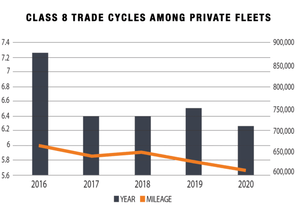 The trade cycle of Class 8 trucks among private fleets accelerated to 6.3 years from last year's 6.5 years, while the overall trade mileage dropped to 610,000 miles, down 20,000 miles from 2019. Both of this year’s results were quicker than any other trade cycles ever reported in the history of the National Private Truck Council's annual survey. Five years ago the figures stood at 8.7 years and 713,900 miles.