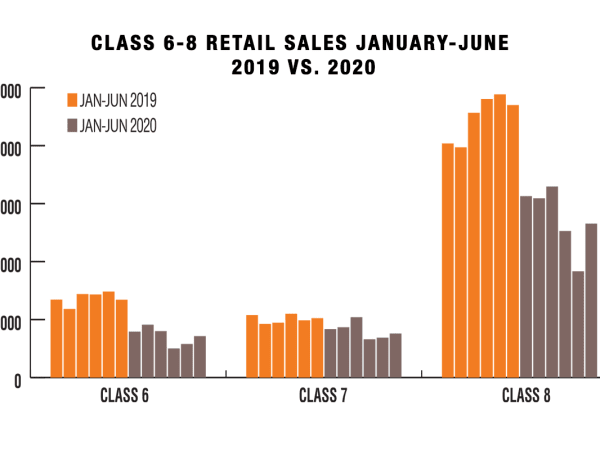 In every class, retail sales saw year-over-year decreases, presumably caused by the COVID-19 outbreak. The Class 8 market saw the biggest decline, with sales plummeting more than 60% in May 2020 compared to May 2019.