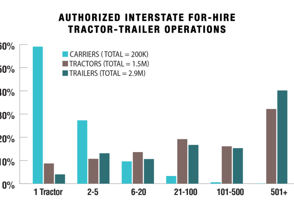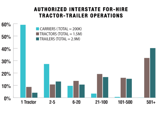 Motor carriers with just one tractor represent 59.1% of all U.S. carriers but only 8.1% of the tractors and only 4% of the trailers operated by authorized U.S. for-hire tractor-trailer operations. On the other end of the spectrum, carriers with more than 500 tractors make up just 0.1% of all carriers but operate 32.2% of the tractors and 40.2% of the trailers.