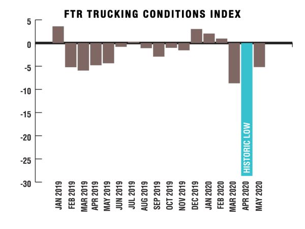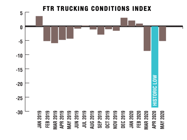 The TCI was significantly negative through the first half of 2019 for the first time since 2015, but conditions had largely stabilized before the COVID-19 pandemic resulted in the worst-ever reading in April 2020. The Trucking Conditions Index tracks the changes representing five major conditions: freight volumes, freight rates, fleet capacity, fuel price, and financing.