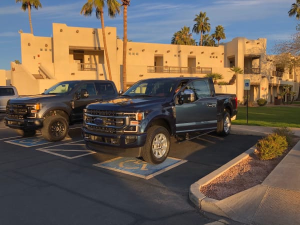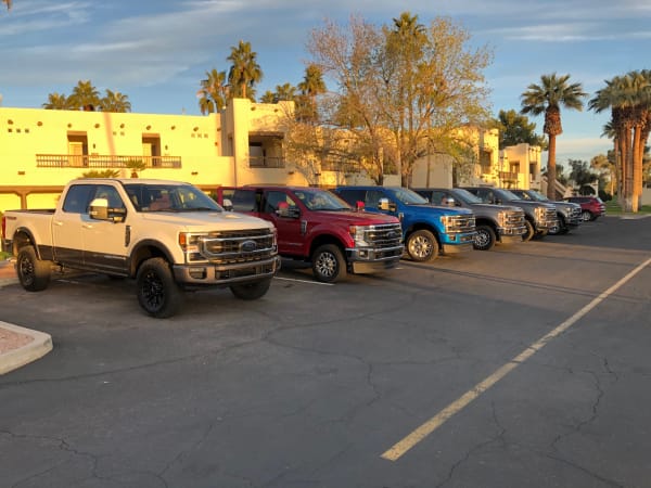 A lineup of brand-new 2020 Super Duty trucks await a day on the Arizona highways.