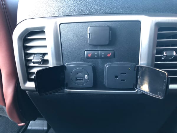 The rear passenger cabin on 2020 Ford Super Duty Trucks is roomy and comfortable with convenient power outlets within easy reach.