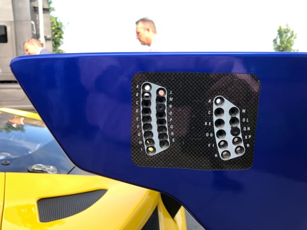 This closeup of the rear spoiler on one of the GT cars shows the wide range of adjustments available to the technicians to fine-tune the car's performance on the track.
