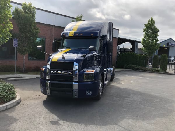 A Mack Anthem decked out in Vital Speed Racing livery on display at TEC Equipment in Portland, Oregon.