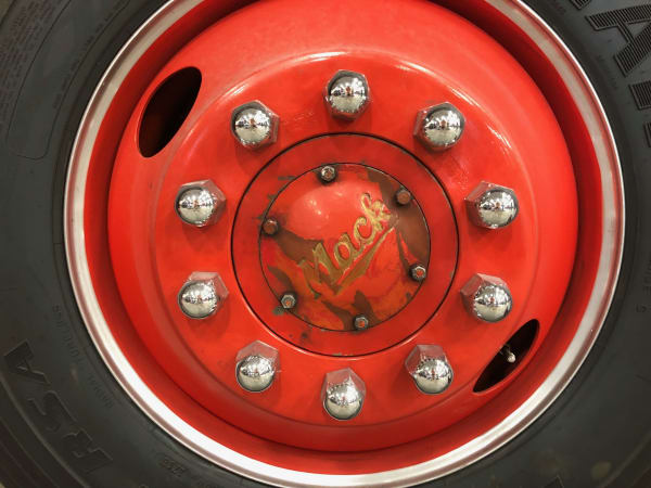 Close up of the wheel on a 1943 Mack Fire Engine undergoing restoration.