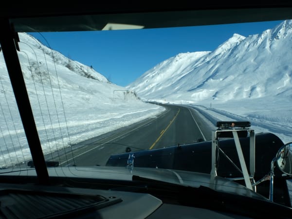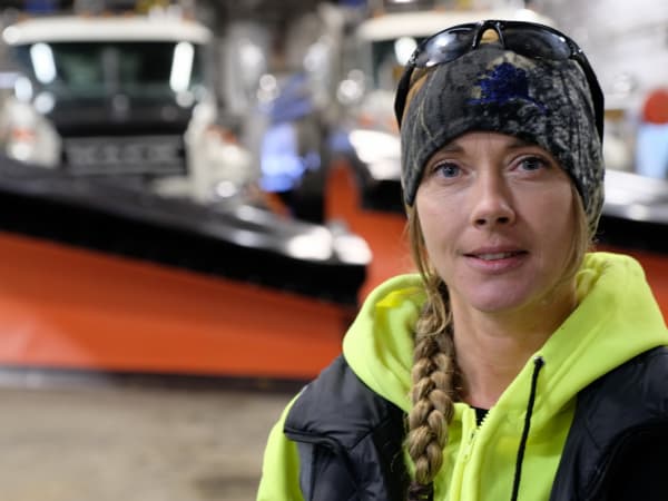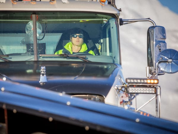 Alaska DOT snow plow driver, Moana Bradshaw. "There are usually two of us on shift at night, and we go out in the trucks. One of usually goes one direction, one of us goes the other. We have 60 miles of [road] to take care of, and we usually overlap in the center, in the gap, because that is where all the action happens."
