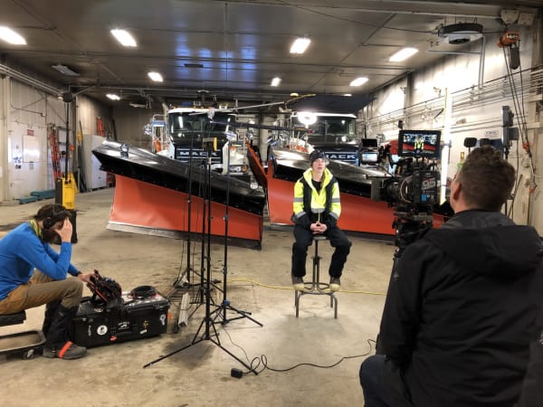 The Mack video crew is set up in the DOT garage to interview snow plow driver, Moana Bradshaw.