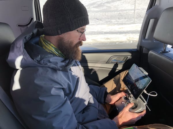 Drone pilot and audio technician, Michael McQueen, steers the drone from the warmth of the chase car. Outside temps that day were about -15 F.