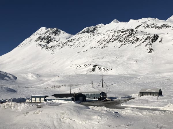 The Alaska DOT maintenance shed at Thompson Pass is nestled in a valley a few hundred yards off the highway. Thompson Pass is a 2,700 foot-high gap in the Chugach Mountains northeast of Valdez. It is the snowiest place in Alaska, recording 500 inches of snow per year on average. In the winter of 1952–1953, 974.1 inches of snow fell—the most ever recorded in one season at one location in Alaska.