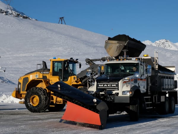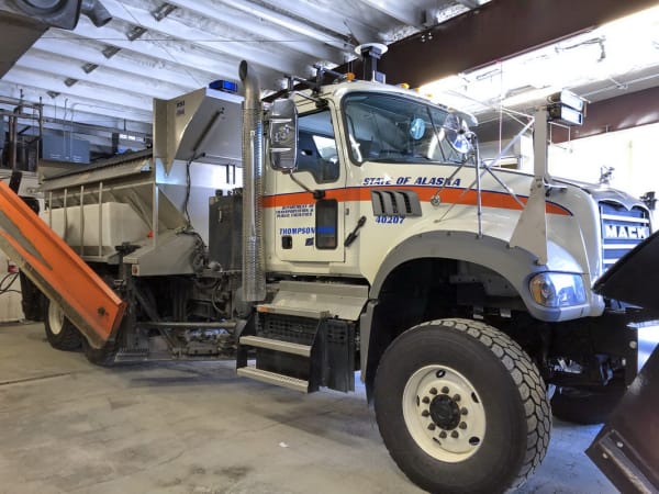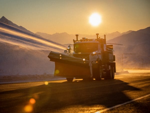 One of the Mack Granite plows driving over Thompson Pass at sunrise.