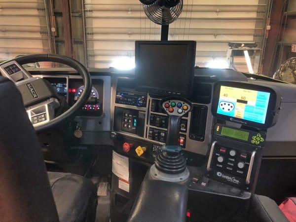 The control consoles inside the Granite cab. The GPS controls are on the lower right, the joystick controls the plow blades and the sand spreader.