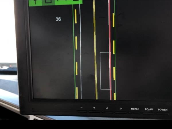 This is the display the driver sees from the GPS devices. The white box represents the truck. The dotted yellow lines are the outside lane markers and the solid yellow line is the center line of the road. The red line indicates the driver has strayed over the right-hand lane marker.