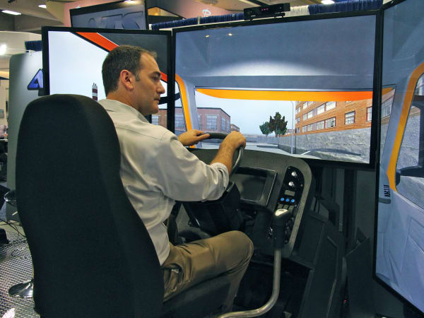 An attendee tries out the driver simulators at the Virage booth.