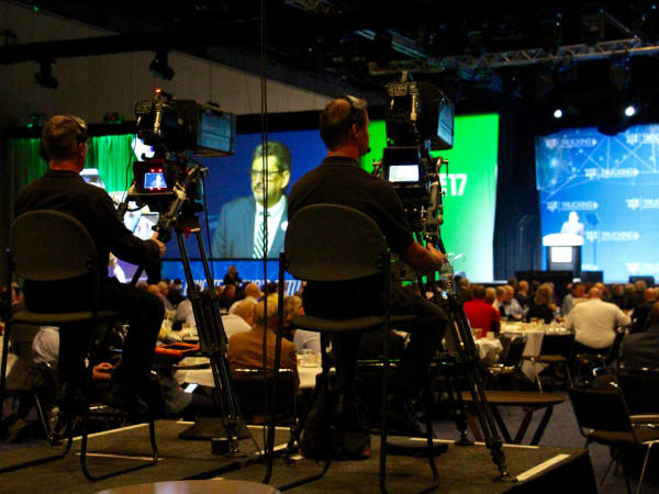 Kevin Burch, ATA Chairman, watching a video during lunch at ATA with hundreds of others attending. Photo: Evan Lockridge