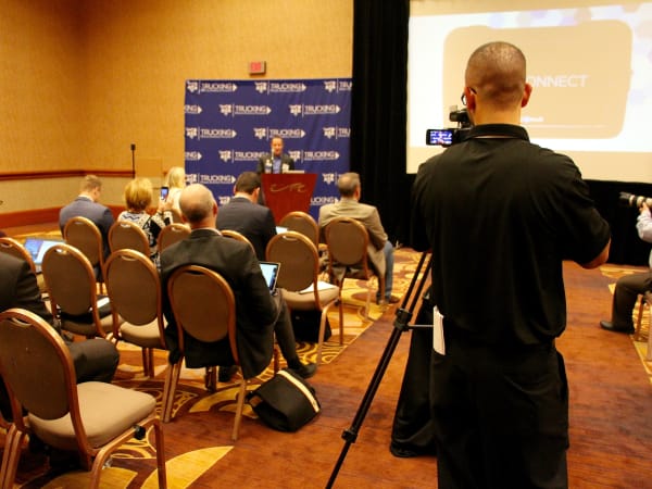 FMCSA Administrator Scott Darling takes a moment to show off a video about the agency. Photo: Evan Lockridge
