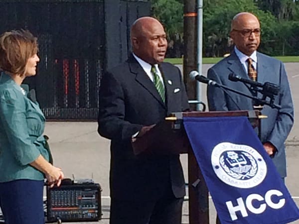 Truck Dealer of the Year Oscar Horton (right) was involved in establishing a new diesel tech program at Hillsborough Community College; here he is at the announcement with College President Ken Atwater and U.S. Rep. Kathy Castro.