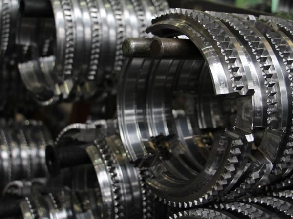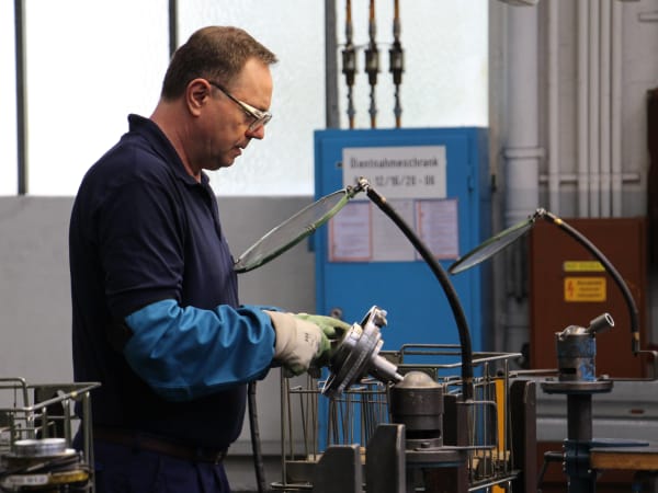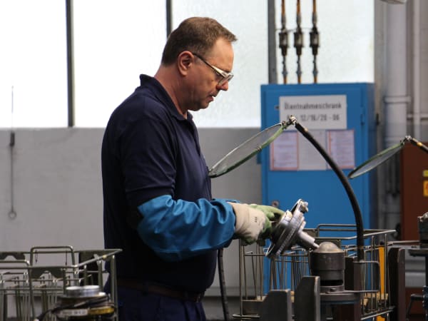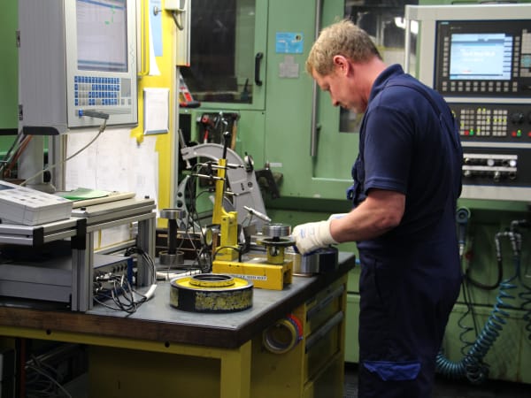 A worker de-burrs a transmission gear during manufacture in Gaggenau.