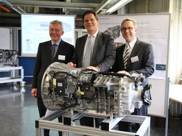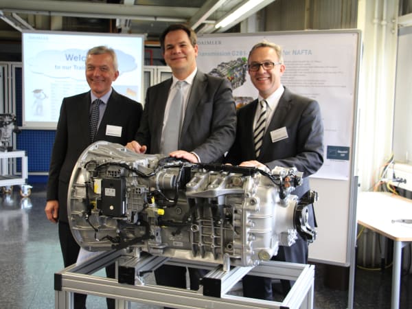 Daimler Trucks officials (from left) Ehrhard Thiel, manager for Gaggenau Powertrain Production; Frank Reintjes, head of Global Powertrain, Procurement and Manufacturing Engineering; and Matthias Jurytko, Gaggenau plant manager, with the new DT12 transmission where it is being assembled in Gaggenau, Germany.