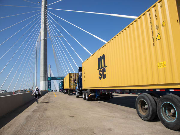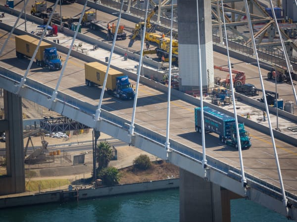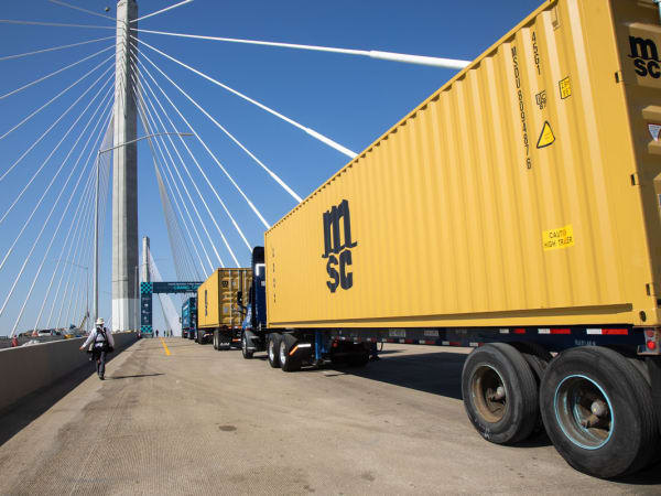 The “first drive” over the bridge was led by 30 cargo trucks representing the port’s terminals and major shipping lines.