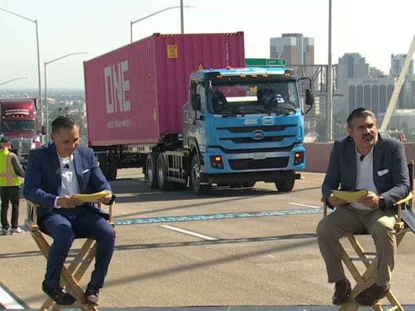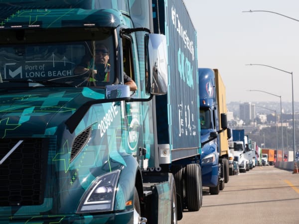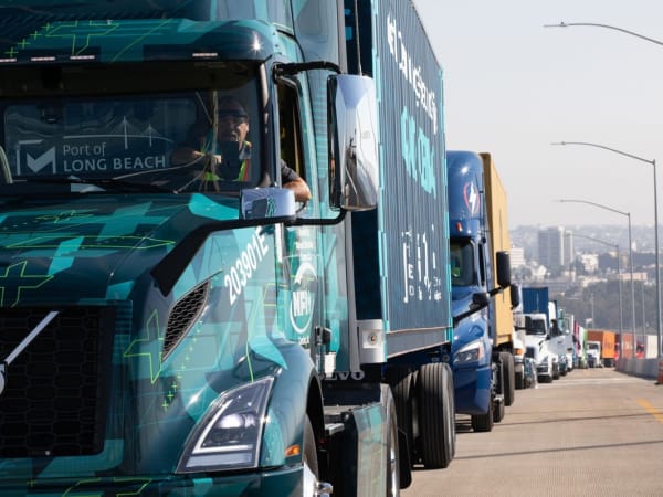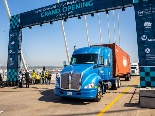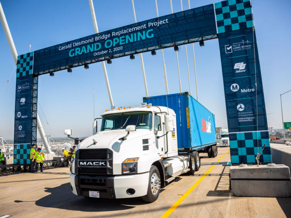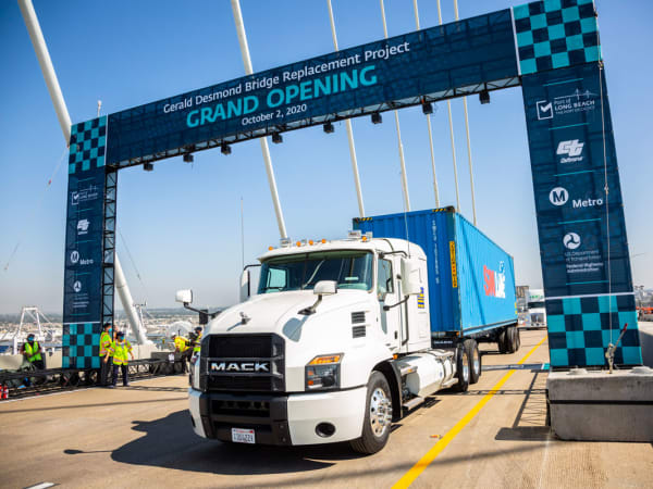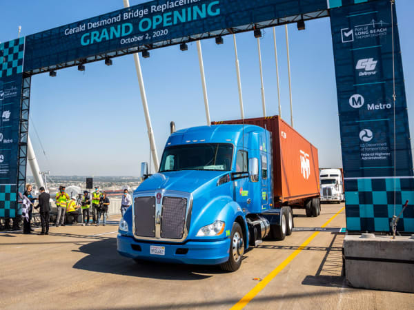 Battery-electric, natural gas, and hydrogen fuel cell trucks from the Port of Long Beach helped celebrate the new Port of Long Beach bridge in a clean trucks parade.