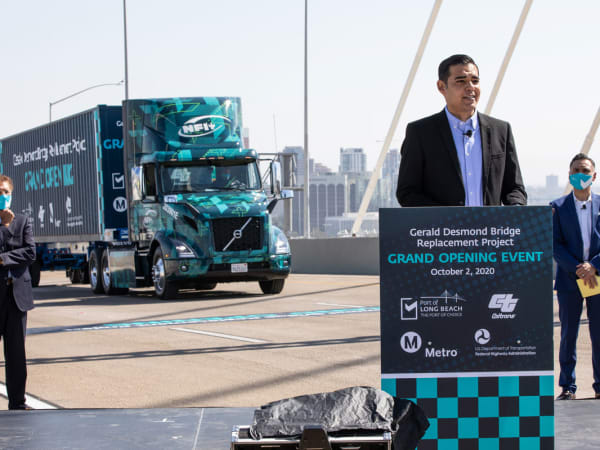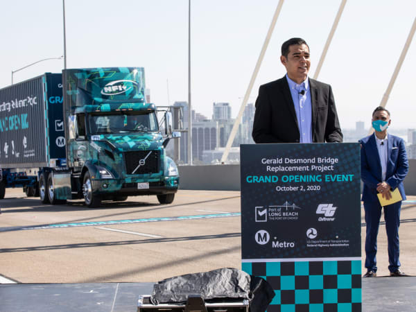 Long Beach Mayor Robert Garcia dedicated the Port of Long Beach’s new cable-stayed bridge before the clean truck parade.