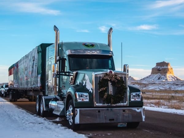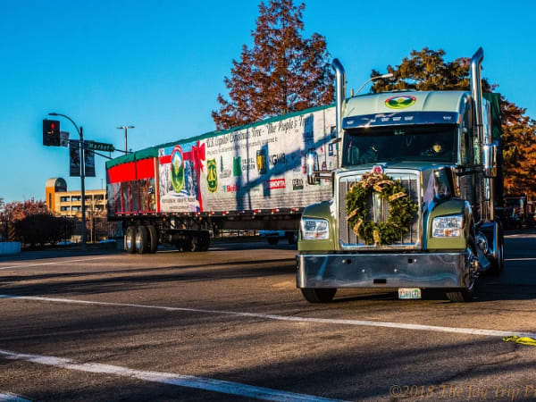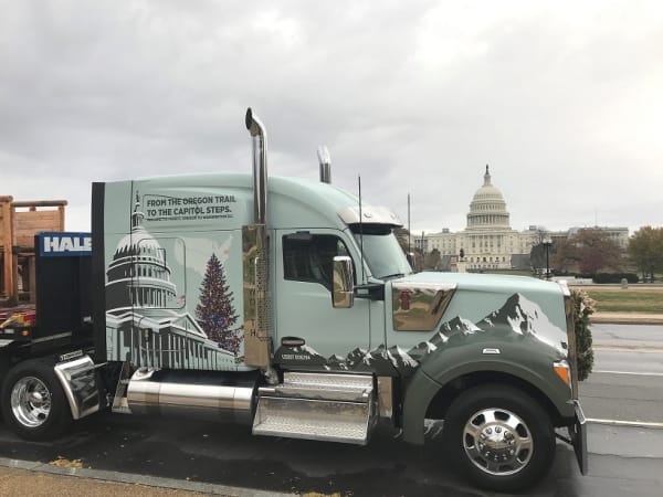 The Kenworth W990 transporting the tree features a distinctive graphics package with a brightly lit and colorfully adorned Christmas Tree next to the U.S. Capitol below the words “From the Oregon Trail to the Capitol Steps.”