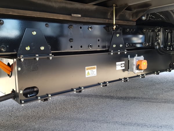 Being prototypes, not production trucks, the battery box containing, in this case, three batteries, is bolted to the underside of the frame. Production specs could see the batteries placed between the frame rails.