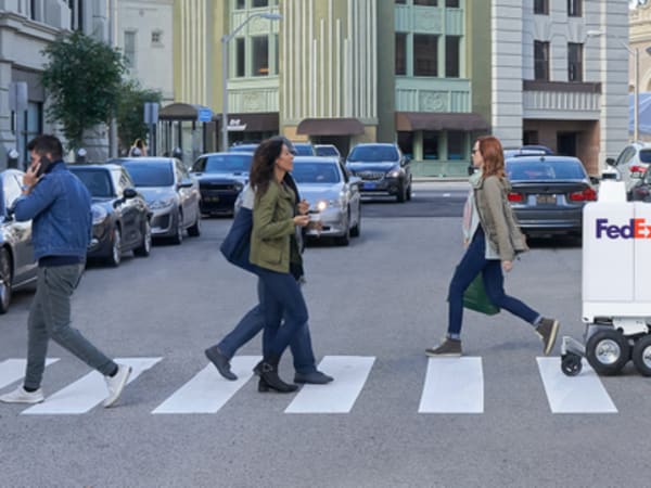 The FedEx Same Day Bot is a six-wheeled device has a top speed of 10 mph and can carry about 100 pounds. FedEx says it can navigate unpaved surfaces, curbs, and even steps.