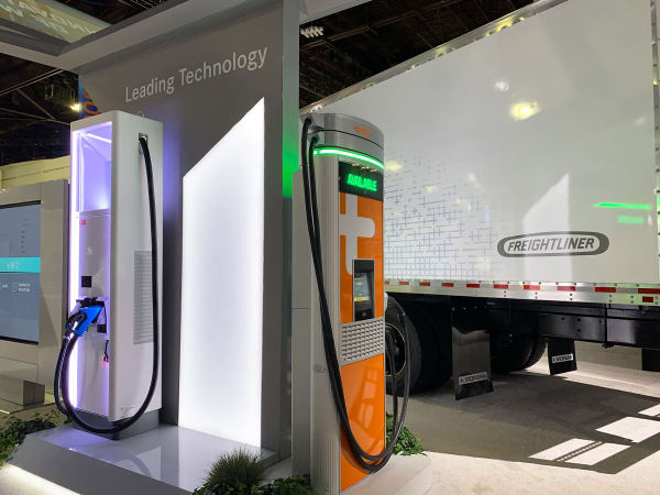 Those battery-electric vehicles need a place to fuel, and Daimler Trucks North America showcased several EV charging options at its booth.