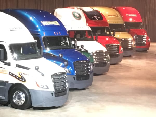 The trucks and their owners: alphabetically, Bison Transport, C.R. England, Crete Carriers, Hartland Express, J.B. Hunt, Knight Transportation, Old Dominion, Prime, Schneider, Swift Transportation, U.S. Express and Werner Enterprises.