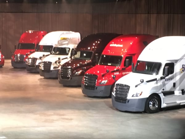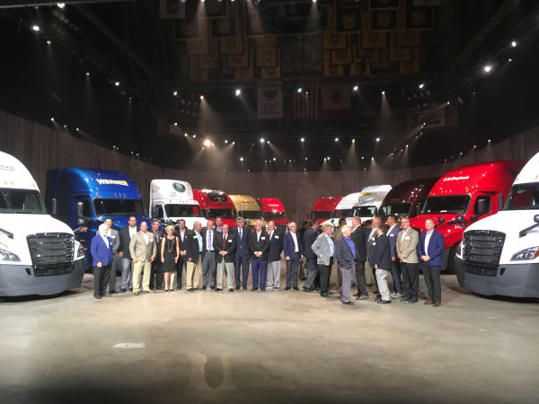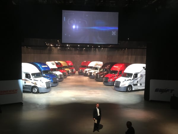 Toby Faulkner, director of New Cascadia development, presents 12 of the first trucks representing the top 12 fleets in North America.