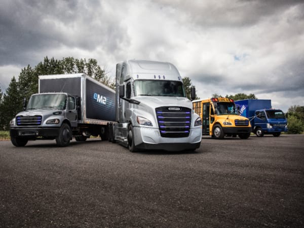 Daimler Trucks’ commercial electric vehicle line-up on display (from left to right): Freightliner eM2, Freightliner eCascadia, Thomas Built Buses Saf-T-Liner C2 Jouley, Fuso eCanter.
