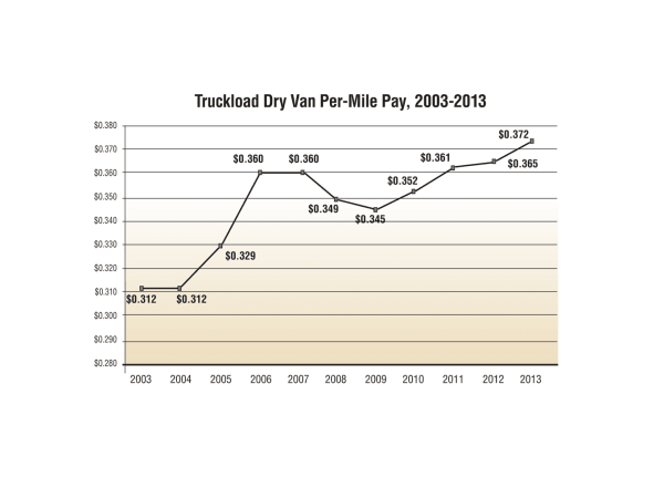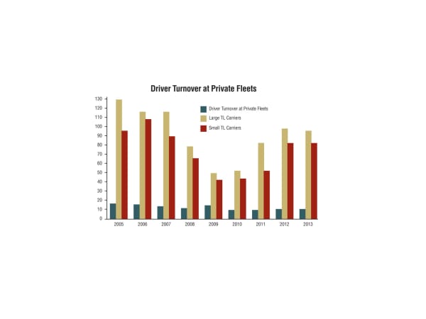 Large truckload carriers have the highest turnover, and hit an all-time high of 136% in the fourth quarter of 2005. Private fleets, however, report exceptional retention and turnover performance — 11.3% last year with an average retention of 11.8 years. Less-than-truckload fleets, not shown here, had an 11% turnover rate in 2013. Source: National Private Truck Council 2013 Benchmarking Survey and ATA American Trucking Trends 2014