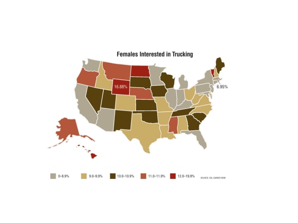 Looking at a 3-year average of its job applicant data, CDL Career Now found the state with the most interest from women was Wyoming, and the least was Massachusetts. Source: CDL Career Now