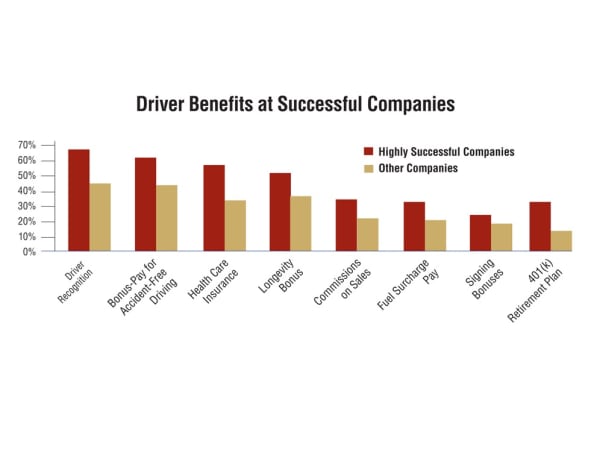 A 2012 survey of 300 trucking companies in Texas found that “highly successful” companies differed from their peers in driver benefits. To qualify as “highly successful,” a company had to report revenue growth, a net profit margin of at least 10% and a minimum of 11 drivers.