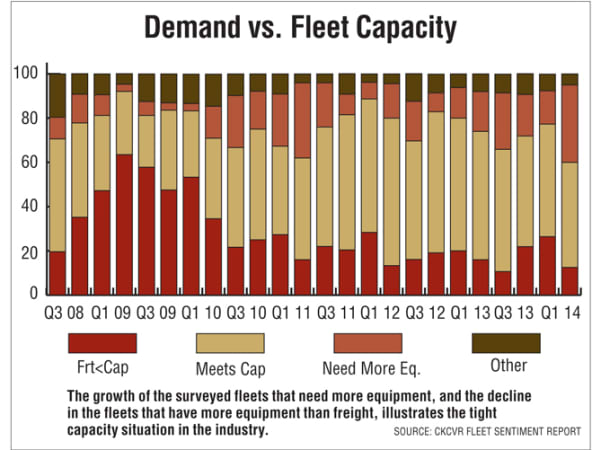 The growth of the surveyed fleets that need more equipment, and the decline in the fleets that have more equipment than freight, illustrates the tight capacity situation in the industry. Source: CKCVR Fleet Sentiment Report