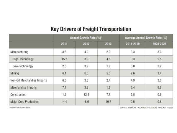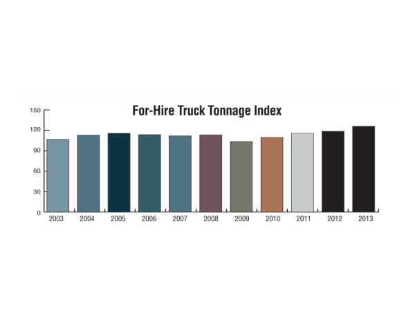 ATA’s For-Hire Truck Tonnage Index averaged 126.0 in 2013, up 6.3% from 2012 and the highest level in history. The previous highest annual average on record was 118.6 last year. In 2012, tonnage increased 2.3%, short of 2011’s 5.8% year-over-year increase. Source: Monthly Truck Tonnage Report, Economics & Statistics Group, American Trucking Associations