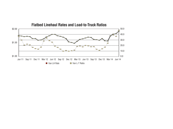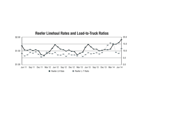 Refrigerated (“reefer”) freight has a strong seasonal element that drives rates up. The spike in load-to-truck ratios and rates in February and March 2014 was atypical, but the extreme weather caused a temporary capacity crisis. Capacity did not recover in time for Q2, and rates continued to climb. Source: DAT Solutions