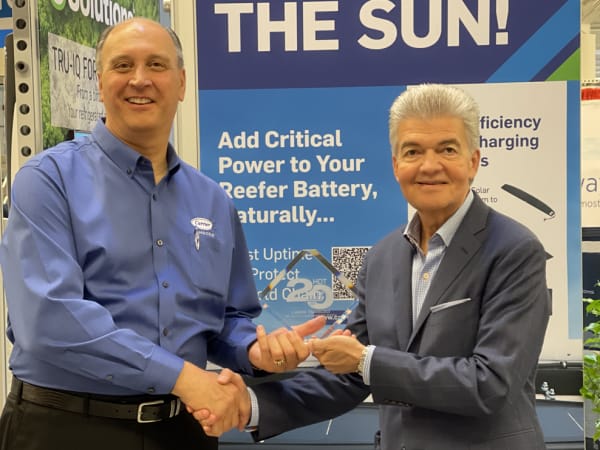 Carrier Transicold's John Monti, region director, East and Canada, accepts the HDT Top 20 Products award for the TRU-Mount Solar Charging System from HDT Publisher David Moniz.