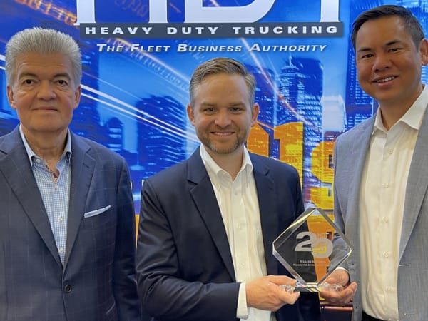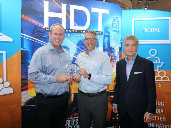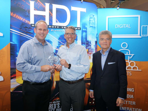 (Left to right) Mark Ulrich, director of customer support, and Nick Roth, director of national accounts, accept the HDT Top 20 Products award for the Cummins Acumen from HDT Publisher David Moniz.