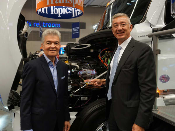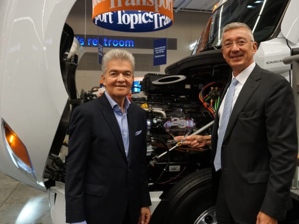 Daimler Trucks North America Chief Engineer of Powertrain Admir Kreso accepts the HDT Top 20 Products award for the Detroit DD15 Gen 5 engine from HDT Publisher David Moniz.