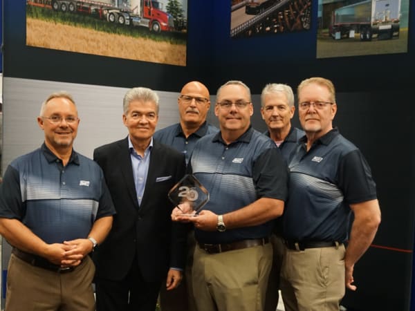 Chris Cooler, vice president of sales and marketing and product manager of dump trailers, and East Manufacturing team accept the HDT Top 20 Products award for the Narrow Spec Dump Trailer from HDT Publisher David Moniz.
