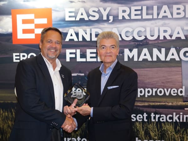 ERoad's Jim Angel accepts the HDT Top 20 Products award for the Clarity Dashcam from HDT Publisher David Moniz.