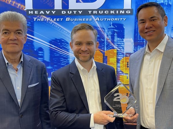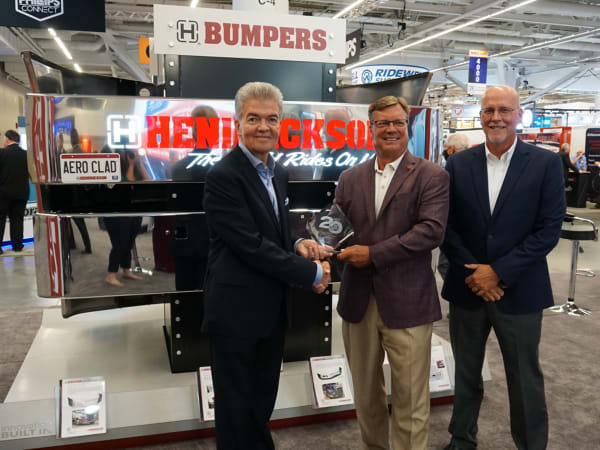(Right to left) Richard Mudd, vice president and general manager of truck commerical vehicle systems, and President and CEO Gary Gerstenslager accept HDT's Top 20 Products award for Hendrickson's Haulmaax EX from HDT Publisher David Moniz.