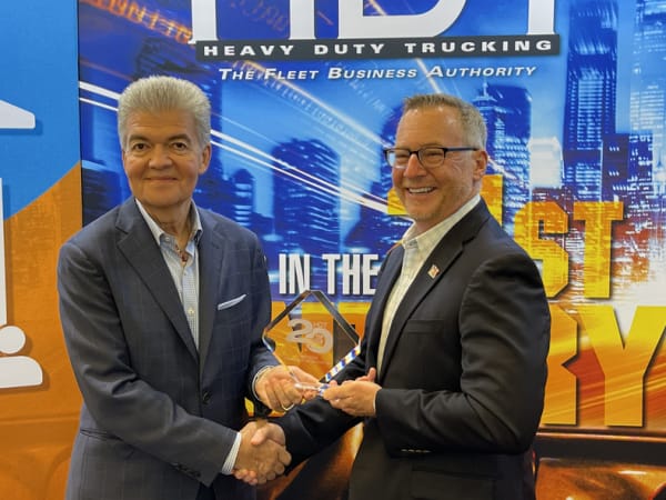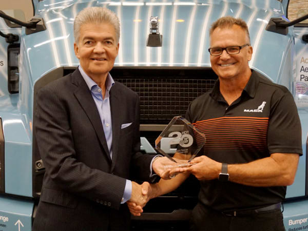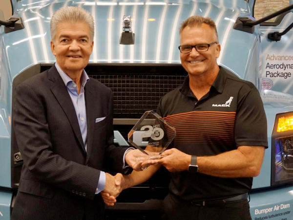 Highway Product Manager Stuart Russoli accepts HDT's Top 20 Products awards for Mack Trucks' Command Steer from HDT Publisher David Moniz.